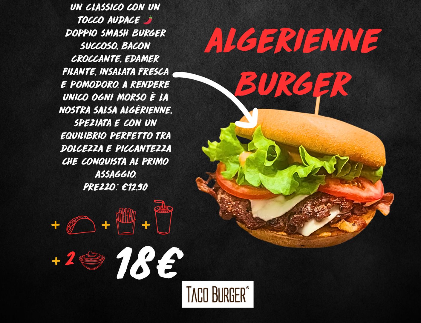 Doppio smash burger succoso, bacon croccante, edamer filante, insalata fresca e pomodoro. A rendere unico ogni morso è la nostra salsa Algérienne, speziata e con un equilibrio perfetto tra dolcezza e piccantezza che conquista al primo assaggio.